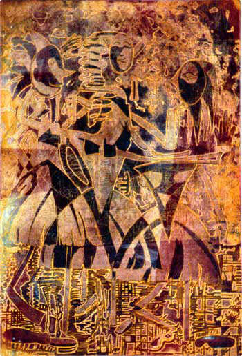 "Gathering", Etching on zinc / Inked Intaglio, Colour Relief, Printed on BFK Reeves paper. Dimensions including border: 19.65" w x 26" h